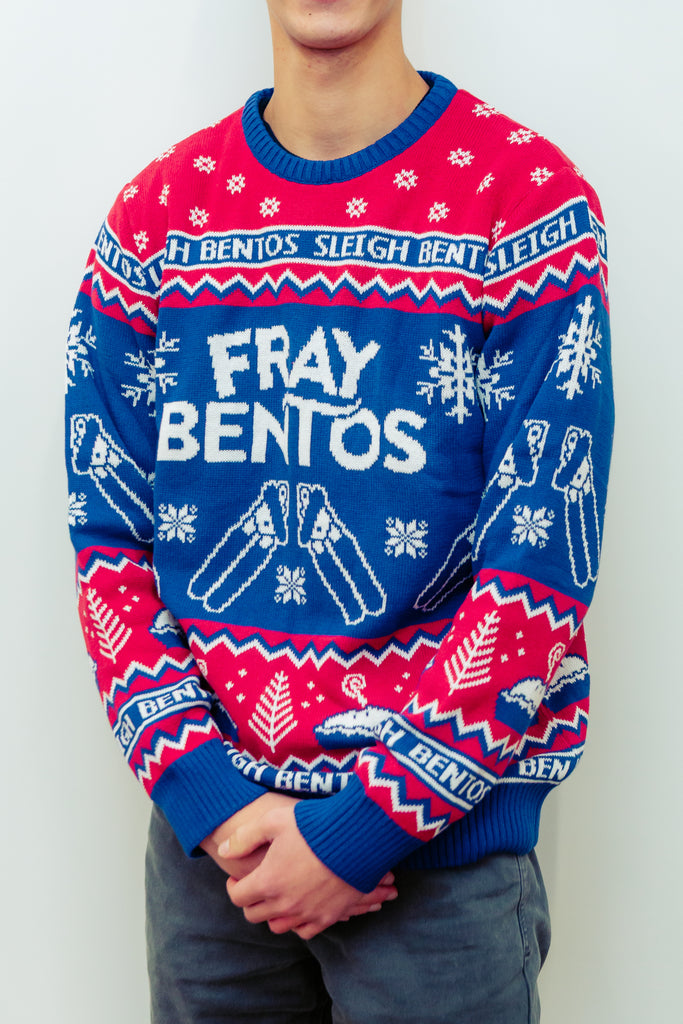 Season’s eatings, Fray fans! Wrap yourself in tin-spired style with our limited edition Fray Bentos Christmas jumper. A winter warmer that’s as bold as our beef pies. Featuring snowflakes, cheeky can opener icons, pie-tastic motifs and our festive ‘Sleigh Bentos’ slogan, this jumper is the ultimate nod to your favourite flaky friend. Whether you're carving turkey or cracking open a tin of our very own Festive Turkey pie, this is the gear to do it in.